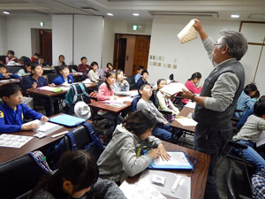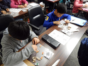 まず始めに箱根ホテル「花月園」で、寄せ木細工職人の石川さんにお話を伺いました。寄せ木に使われる木の話や、どうやって模様を作るのかなどを、実演を交えて話していただきました。中でも、実際に鉋(かんな)で木を削って見せてくれた場面では「すごい!」「こんなに薄くなるの?」と驚きを隠せませんでした。お話の後は、18個のパーツを使ったコースター作りを行いました。質問タイムでは、時間が足りなくなる位たくさんの質問をしていました。非常に意欲的でした。