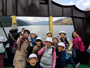 花月園でお弁当を食べた後、午後の見学場所「箱根ふれあい館」に向かう観光船に乗船しました。ここでは、芦ノ湖の大きさを生で見られました。そして、箱根の山々を始めとした、壮大な自然を感じることができました。天気も良く、木々が紅葉している様子がはっきりとわかり、時期的にも最高の見学になりました。