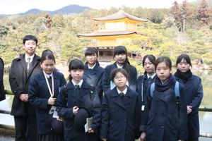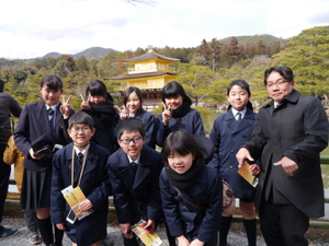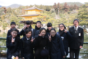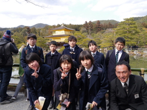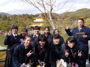 タッチラリーのチェックポイントとして全員が見学をした金閣寺は、湖面に逆さ姿が映えるほどの晴天に恵まれました。黄金に輝く金閣寺が、太陽光を受けて輝いていました。