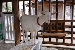 すっかり小学部になじんできたヤギのバニラ、小屋の中の台の上はお気に入りの場所です。