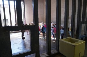 ズーラシアに着いてすぐ、普段入ることのできないゾウ舎のバックヤードを見学しました。ゾウ舎に入ると、すぐ目に入るのは太い鉄の檻。気性の穏やかなゾウは直接飼育(檻の中に飼育員さんが入ってお世話をする飼育方法)ができるので、檻の格子は人が一人通れるくらいの幅があります。何かあったときにすぐに檻の外へ出られる工夫です。