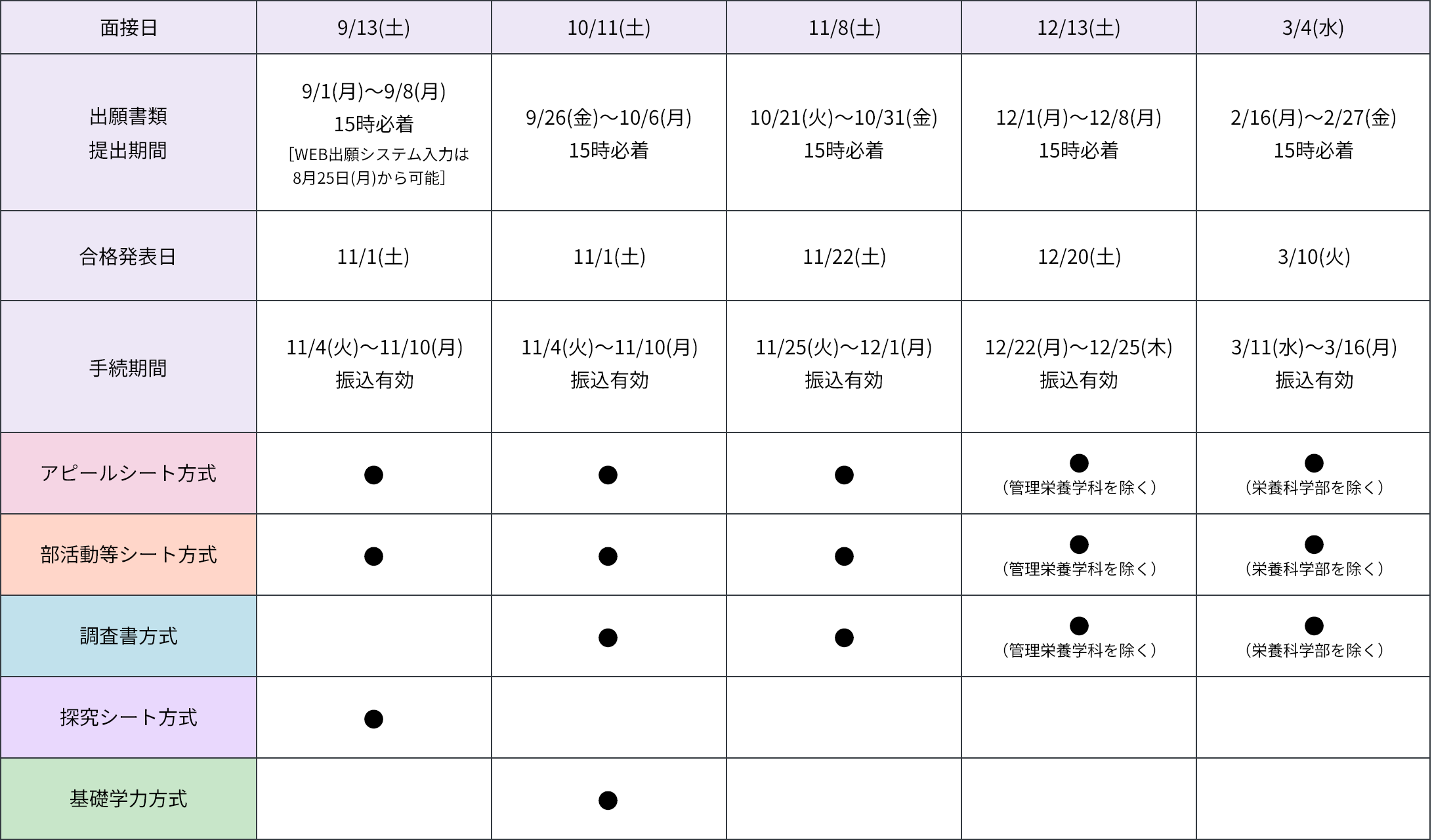 土曜日については、本学ホームページの窓口開室カレンダーをご確認ください。 - 9月面接の場合、 調査書は選考後に提出(入試ガイド8〜10ページ参照)。