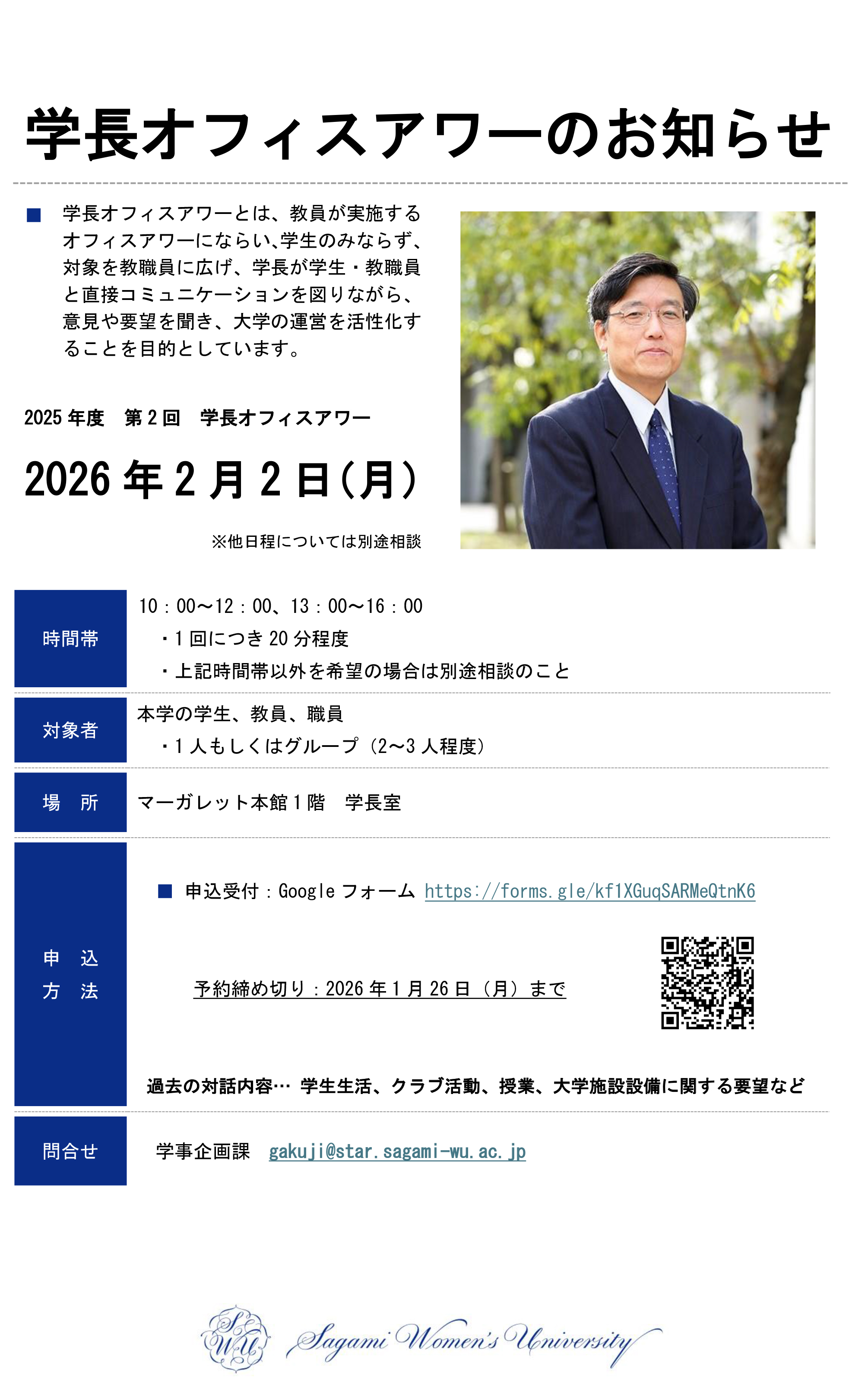 | 申し込み方法 | ■申込受付:Googleフォーム https://forms.gle/kf1XGuqSARMeQtnK6 予約締め切り:2026年1月26日(月曜日)まで 過去の対話内容… 学生生活、クラブ活動、授業、大学施設設備に関する要望など |
