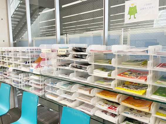 就職支援課・就職情報サイト等のイベント案内を設置しているコーナーです。こちらに配架されている書類については、自由に閲覧・持ち帰りが可能です。