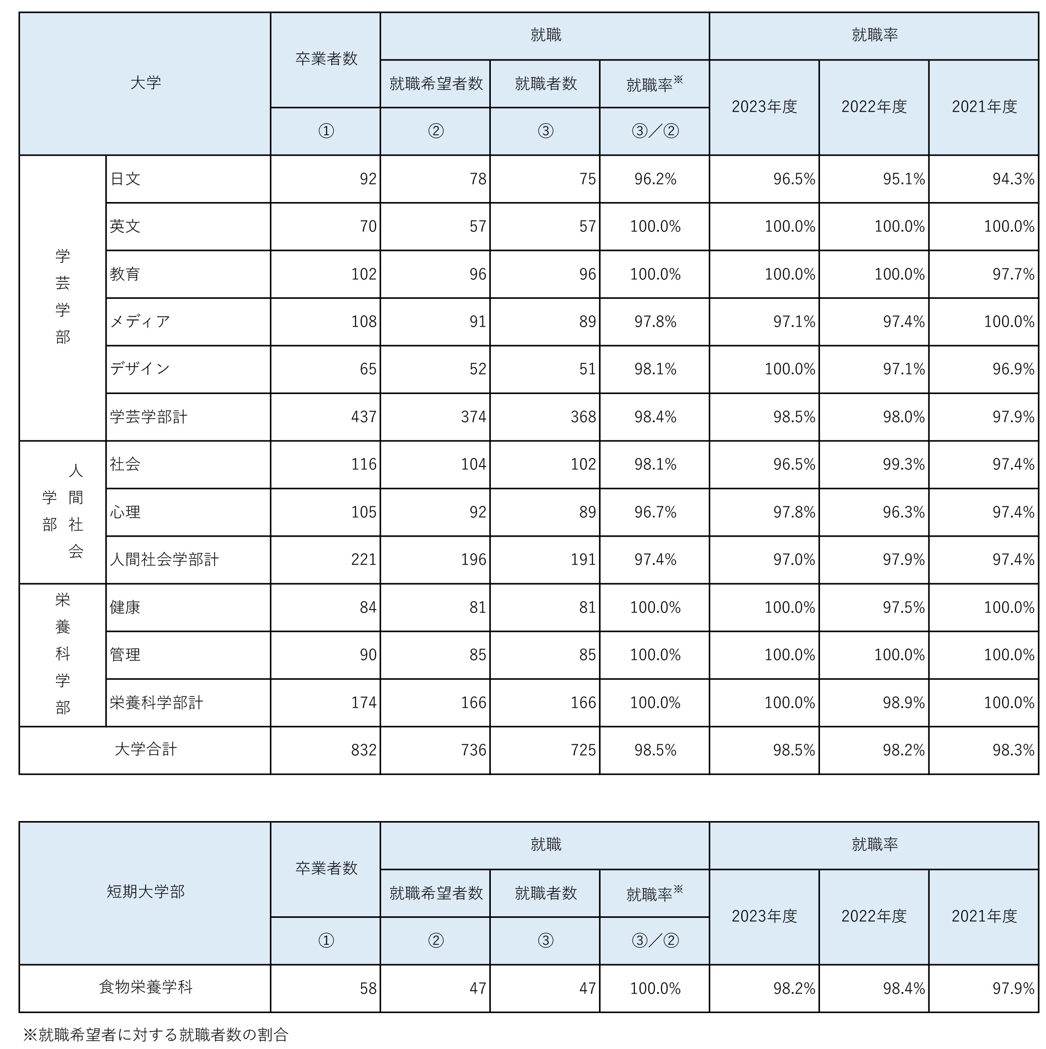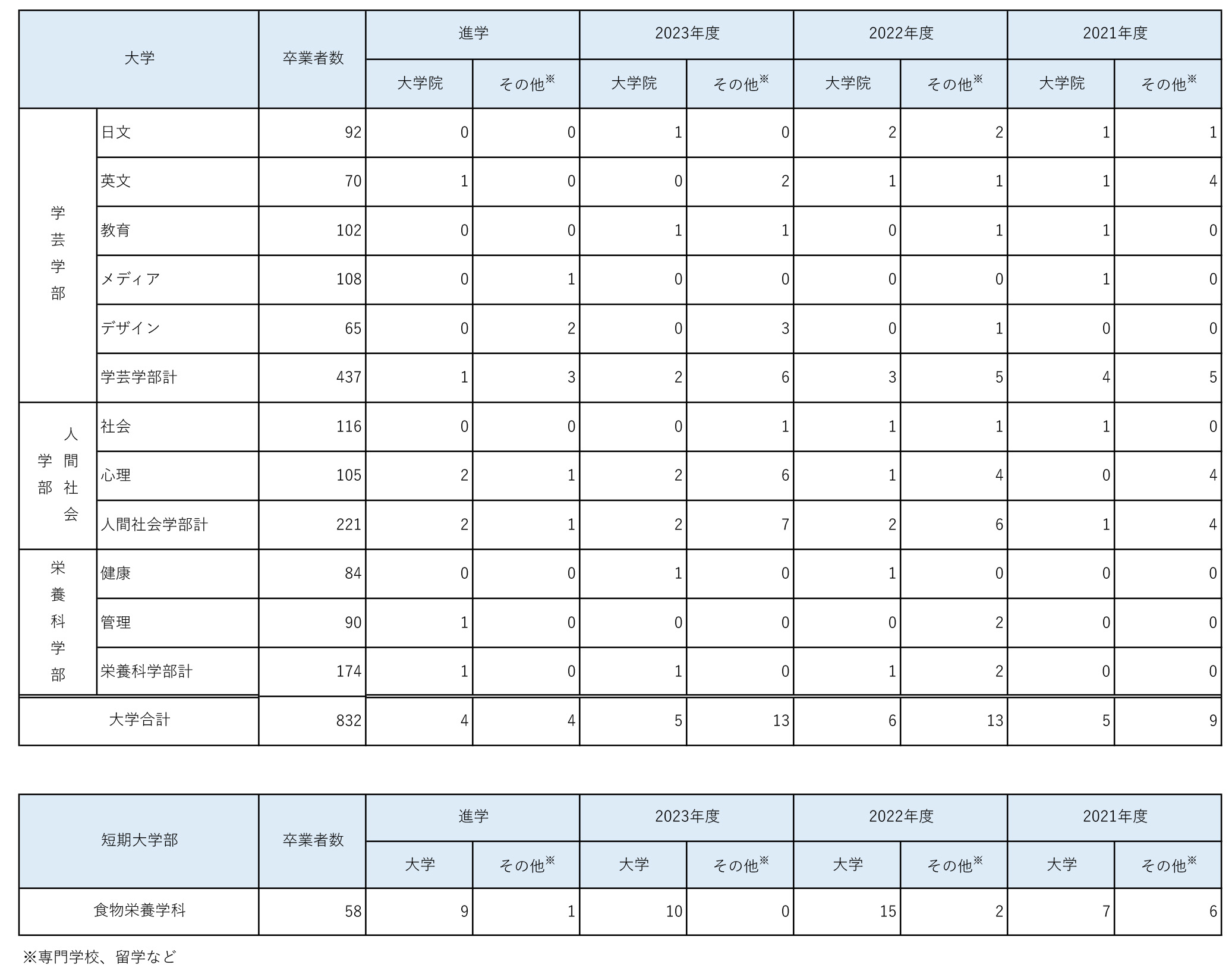 学科別就職先 ページ内目次 進路状況(大学・短期大学部) 進路状況(大学院) 学科別就職先 進路状況(大学・短期大学部) 2024年度卒業生 就職状況 *2025年5月1日現在 2024年度卒業生 進学状況 *2025年5月1日現在 進路状況(大学院) 2024年度卒業生 就職状況 *2025年5月1日現在 学科別就職先 (近年の主な就職先) ■ 学芸学部 日本語日本文学科 英語文化コミュニケーション学科 子ども教育学科 メディア情報学科 生活デザイン学科 ■ 人間社会学部 社会マネジメント学科 人間心理学科 ■ 栄養科学部 健康栄養学科 管理栄養学科 ■ 短期大学部 食物栄養学科