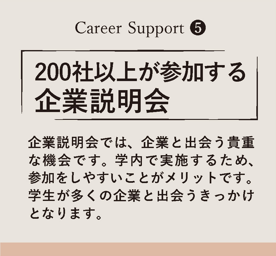 学内にいながら多くの企業と出会える機会を設けています。毎年多くの学生が参加し、内定に繋がっています。