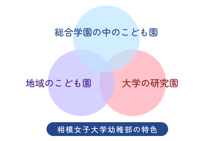幼児教育としては明治36年(1903年)に日本女学校附属幼稚園が開設された後、現在の相模女子大学幼稚部として開園したのは昭和25年(1950年)4月となります。平成12年(2000年)には設立50周年を迎え、式典も行われました。当幼稚部は相模大野駅に近く、自然環境に恵まれた17万平方メートル(約5万2千坪)の広大な校地内にあり、非常に理想的な教育環境にあると言えるでしょう。