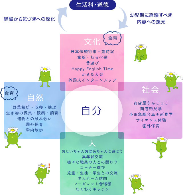 「幼稚部つなぐ手」では、幼稚部の教育・保育内容を、自分との繋がりという観点から、自分を中心において、「自然=身近な自然との繋がりに関する活動」「社会=身近な社会との繋がりに関する活動」「人=色々な人との繋がりに関する活動」「文化=多様な文化との繋がりに関する活動」の4つの観点より分類して、カリキュラムマネジメントによって子どもたちの経験や活動が、継続していく中で深化していくようなカリキュラムの構造化を試みています。
